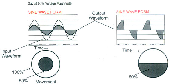 | 1.No wave form distortion at any load. Electrical wave form is like a moving wheel. For 50% Rated Voltage the Dia of wheel is reduced accordingly i.e. magnitude for a wave is decreased. | 1.Wave form distortion. It is like cutting the wheel by 50% and then moving the wheel i.e. wave form is cut as shown at full magnitude. |